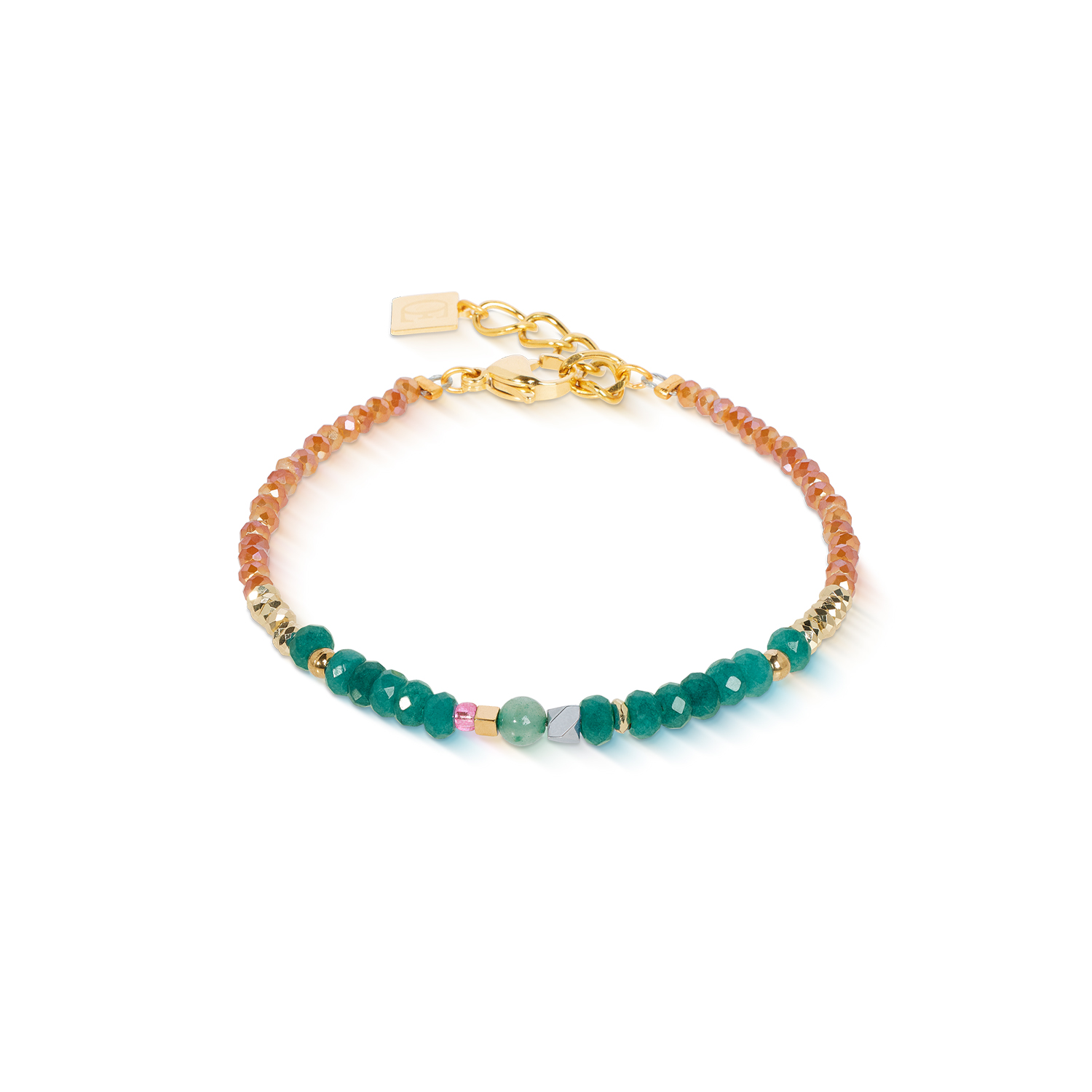 Viel Farbe, viel Charakter – das Armband greift die facettenreiche Farbwelt der passenden Halskette auf und bringt sie in ein tragbares Design für jeden Tag. Mit Aventurin, gefärbter Jade, geschliffenem Glas und Crystal Pearls by Swarovski® verbindet es natürliche Elemente mit glänzenden Details aus Edelstahl in Goldoptik.