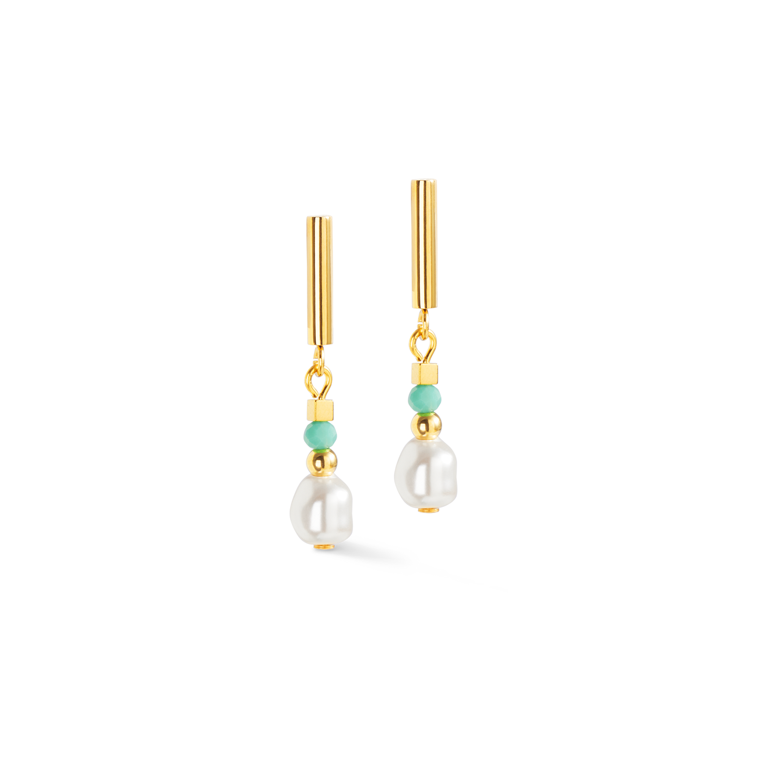 Kühl, frisch und einfach elegant – die Ohrringe Lagoon Pearl gold-mint spielen mit sanften Minttönen, schimmernden Crystal Pearls by Swarovski® und edlem Edelstahl in Gold. Die leichten, fließenden Farben erinnern an klares Wasser und sonnige Tage – ein Must-have für einen modernen, strahlenden Look.