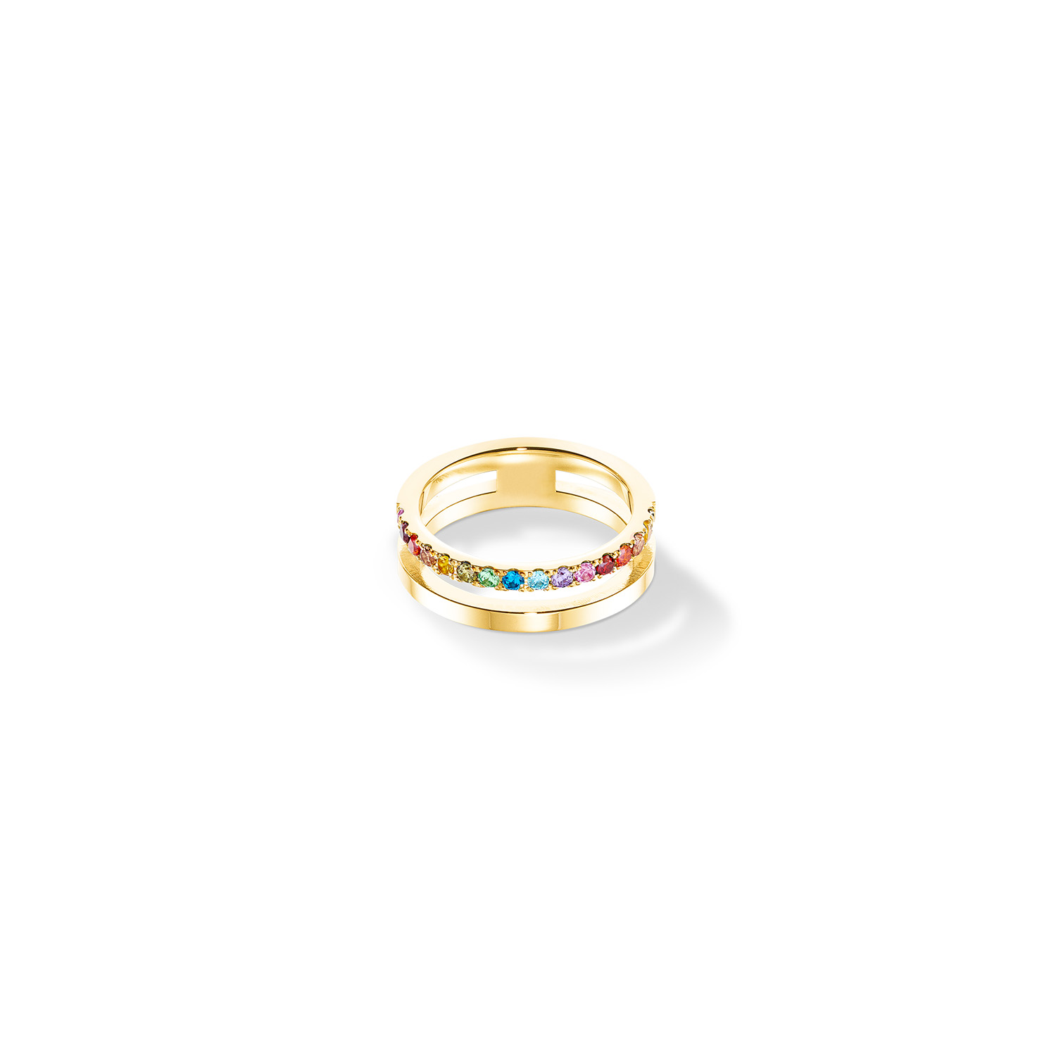 Zwei parallel geführte Bänder prägen das Design: Ein glatt poliertes, goldfarbenes Element steht für Beständigkeit und Klarheit, während das zweite Band mit Zirkonia-Kristallen im Rainbow-Farbverlauf besetzt ist. Die schimmernden Farbnuancen verleihen dem Ring eine lebendige Dynamik und machen ihn zu einem stilvollen Statement – solo getragen oder kombiniert mit Creolen und Armreif der Serie.