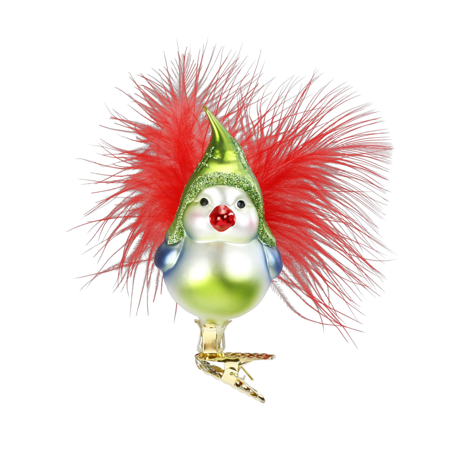 Zwick-Vogerl mit lustiger grüner Mütze und echten Federn, h: ca 8,5 cm, grün-weiß-rot