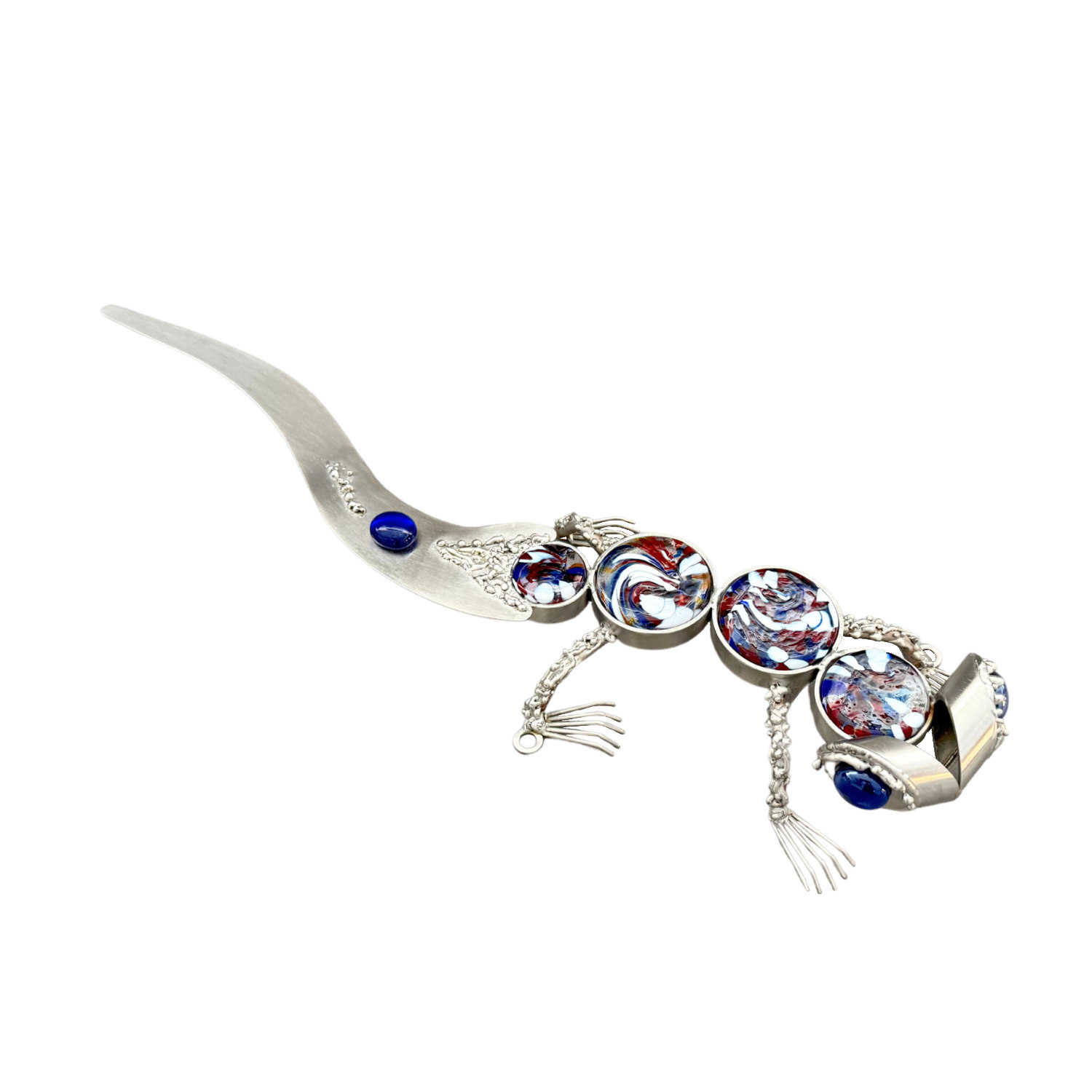 Handgefertigte Figuren aus rostfreiem Edelstahl in Kombination mit massiven, gegossenen Glasscheiben.