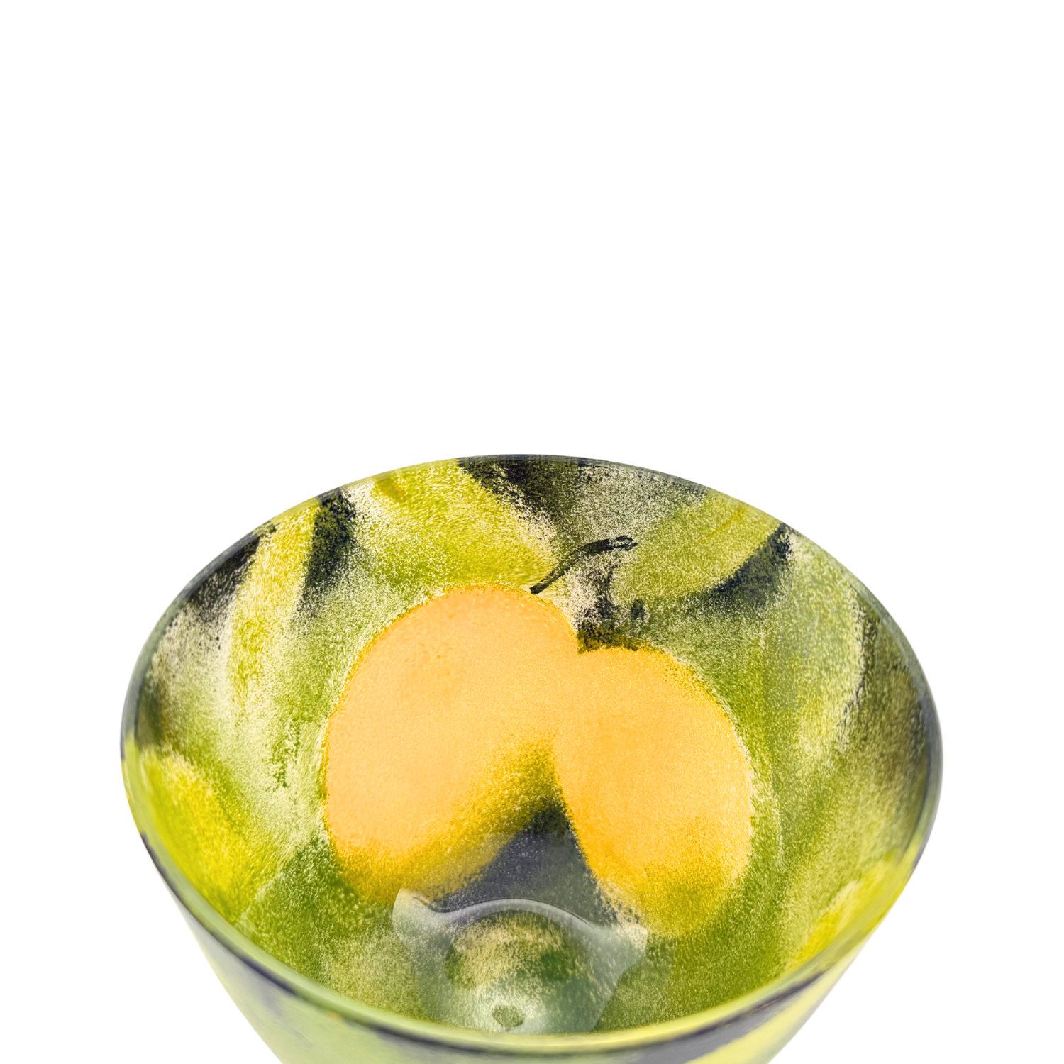 mundgeblasene Schale h: ca. 10,5 cm, Ø (oben) ca. 13 cm, handgemaltes, eingebranntes Dekor