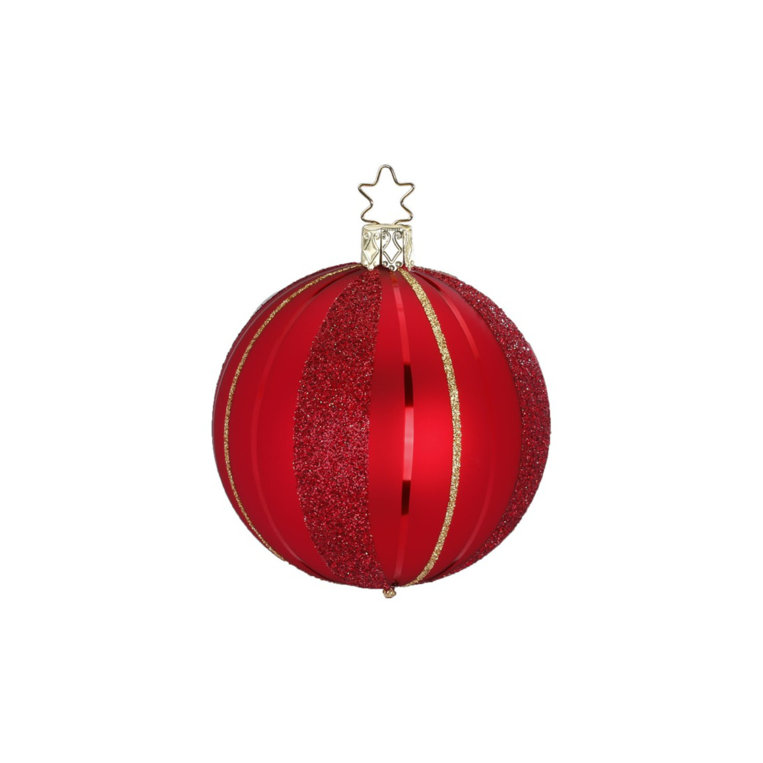 mundgeblasene, handdekorierte Weihnachtskugel im klassischen Stil in rot-matt, mit glitzernden, Goldlinien und Längsstreifen in rot,