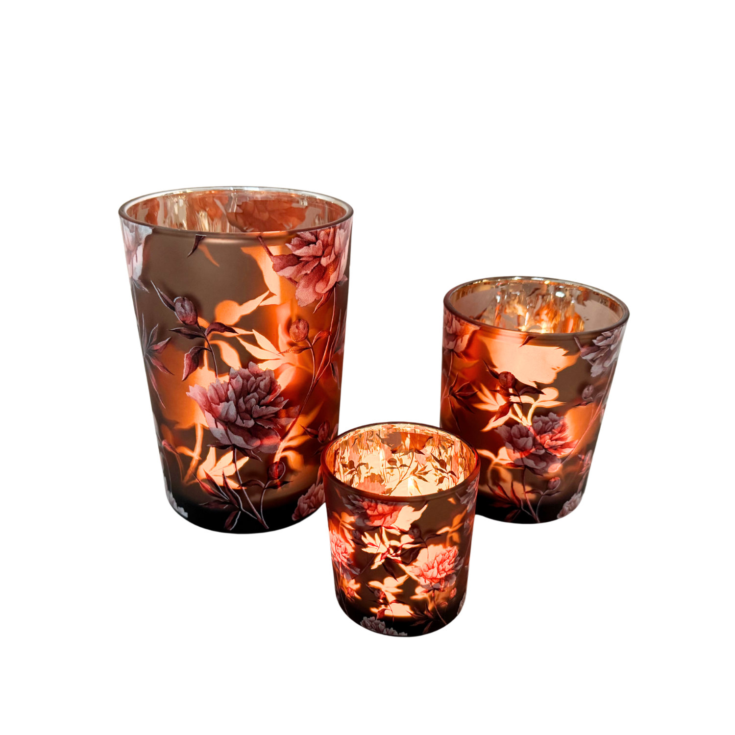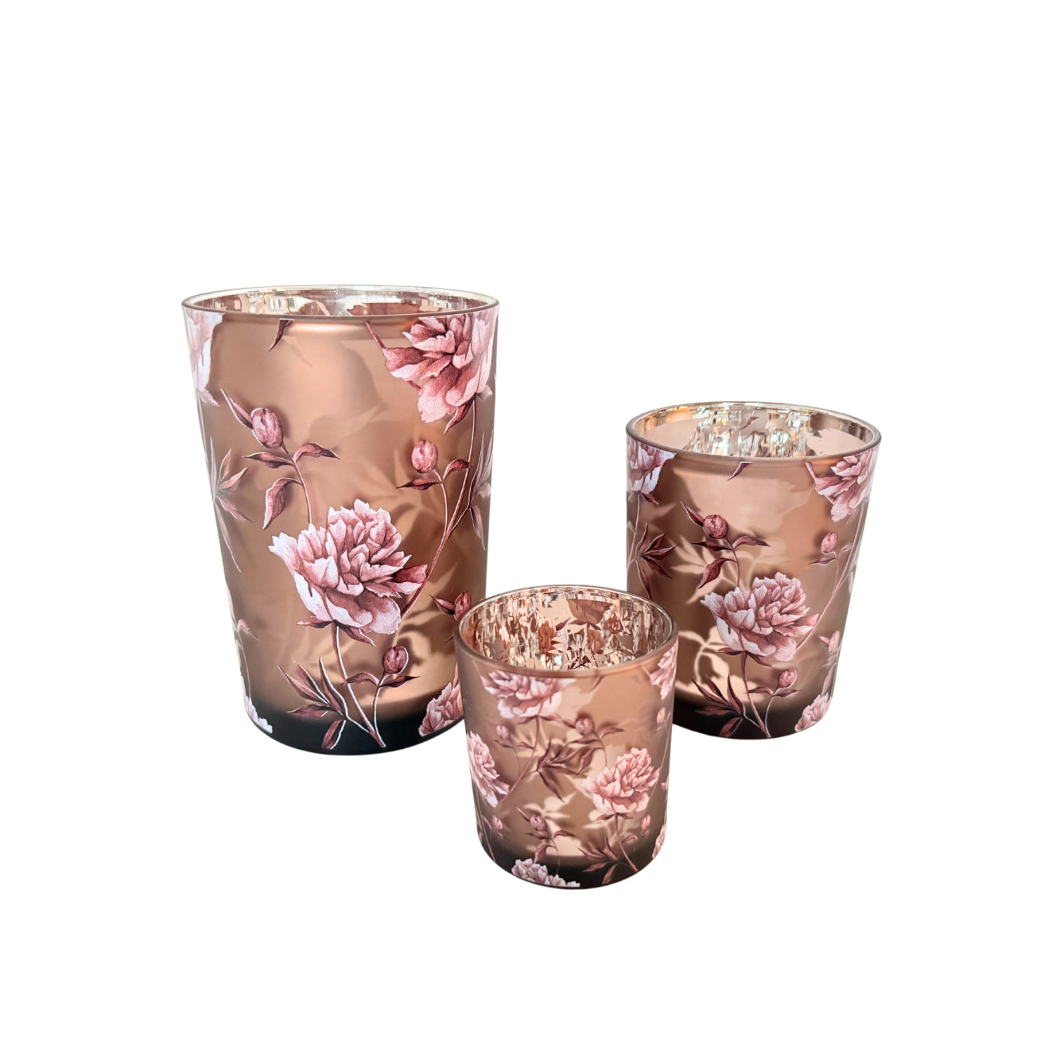 Mauve-taupe-farbene Glas Windlichter mit Blumen-Motiv rundum, in rosé-weiß-lila,