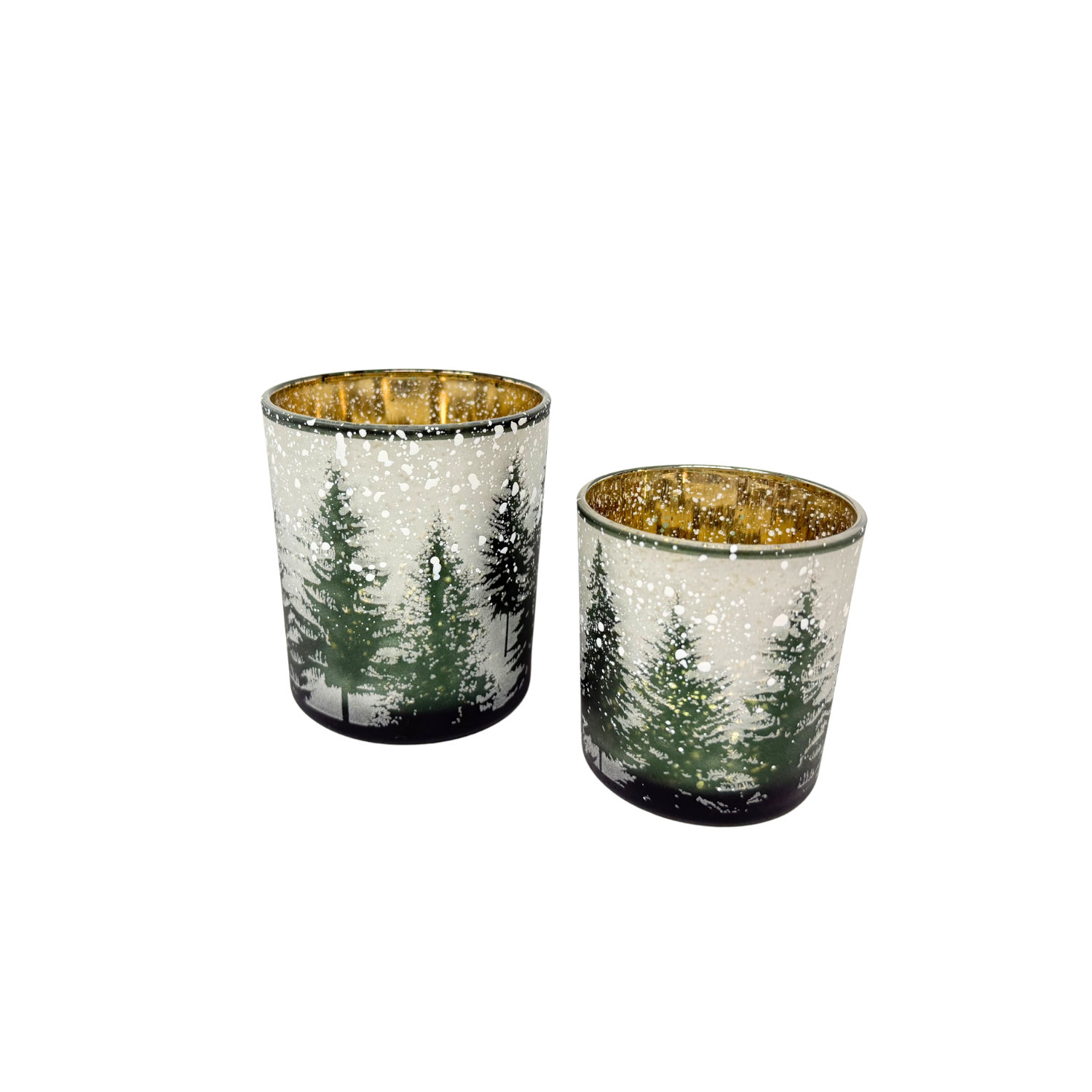Windlichter mit Bäumen mit dicken Schneeflocken grün – weiß rundum,
