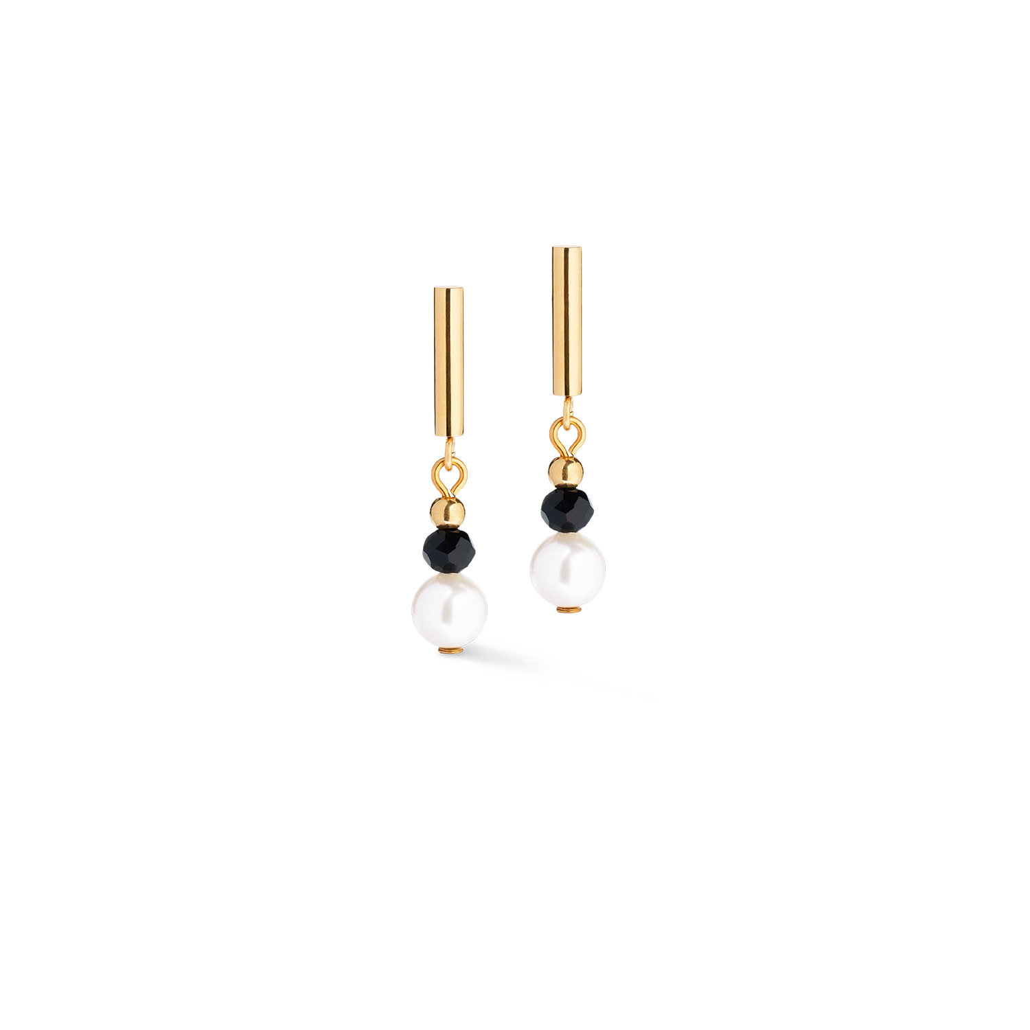 Die Ohrhänger Trinity Spikes gold spielen mit klaren Linien und kontrastreichen Formen. Facettierte schwarze Kristalle und Swarovski® Crystal Pearls treffen hier auf vergoldeten Edelstahl, der dem Design edlen Glanz verleiht. Ihre schlanke, vertikale Form unterstreicht die moderne Klarheit der Serie, während die geometrische Gestaltung für einen markanten Akzent sorgt.