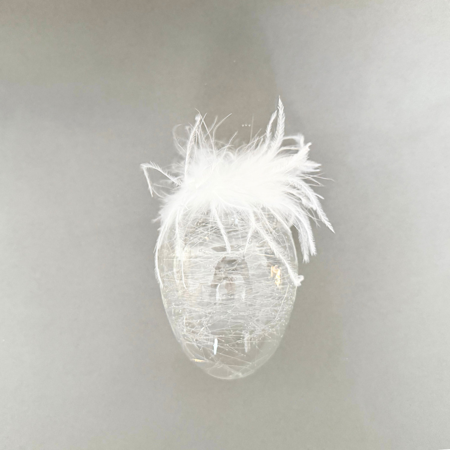 Glas-Ei,  mundgeblasen, mit Glasfäden und Federn auf der Öse